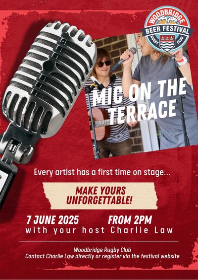 A Get ready for a highlight of the Woodbridge Beer Festival! The Mic on the Terrace is back, offering a vibrant open mic session where talent of all kinds takes center stage. Hosted by the fantastic Charlie Law, this is your chance to witness incredible performances from local musicians, captivating poets, and hilarious comedians – all while enjoying the fantastic atmosphere of the beer festival. Whether you're a seasoned performer or just looking to share your passion, the Mic on the Terrace promises unforgettable entertainment.